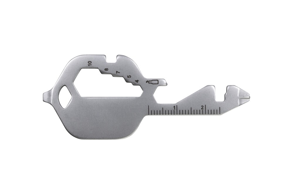 Multifunktionswerkzeug aus recyceltem Edelstahl mit Karabiner, Einkaufswagenchip, Lineal und 3 Gabelschlüsseln.