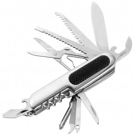 Stainless steel pocket knife with 11 functions. Includes a bottle opener, can opener/flat head screwdriver, corkscrew, Philips screwdriver, two saws, pair of scissors, two small knives, a large knife and a wire bender.