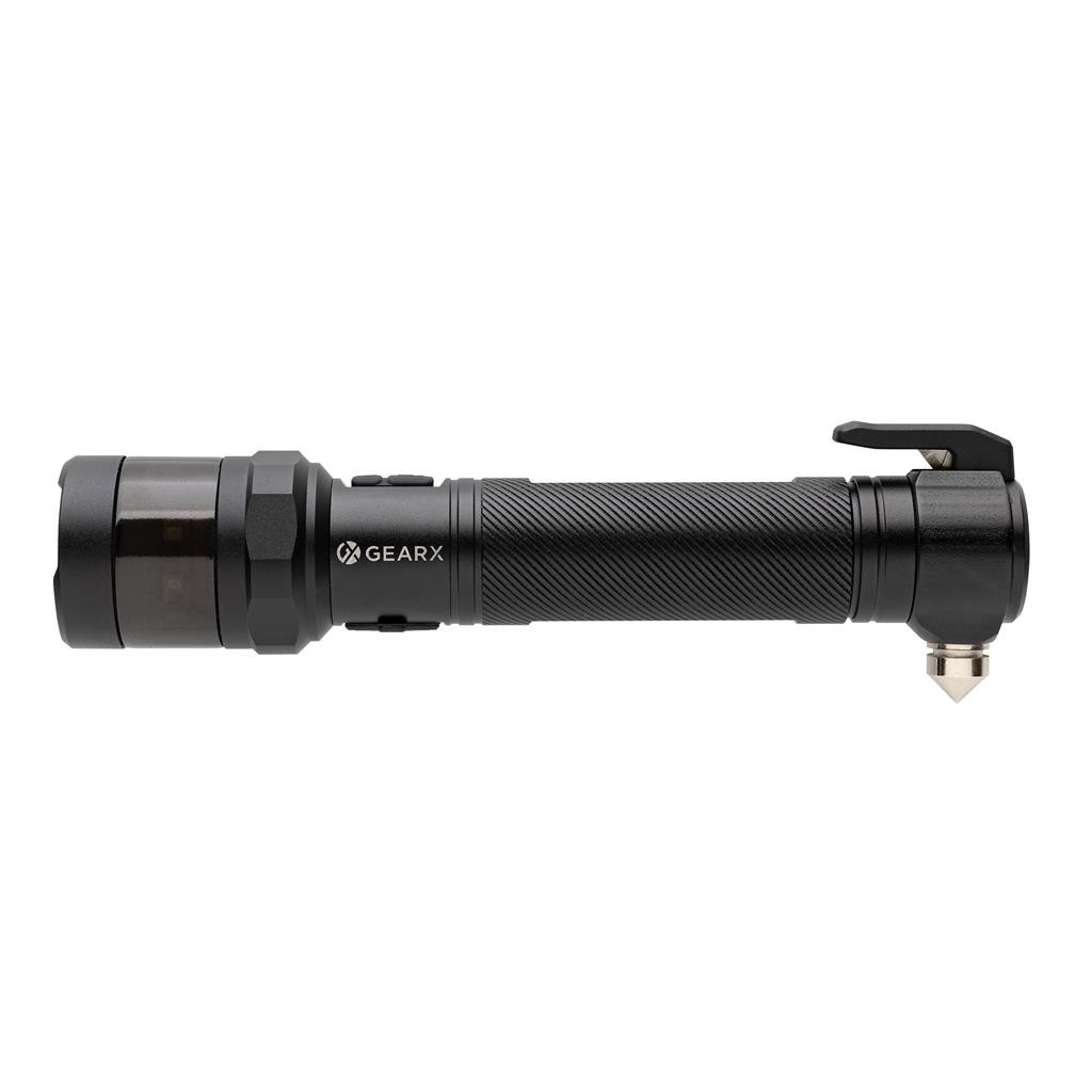 Heavy-Duty Sicherheits-COB-Tool aus RCS-zertifiziert recyceltem Aluminium und ABS. Gesamter recycelter Inhalt: 59% bezogen auf das Gesamtgewicht des Artikels. Die RCS-Zertifizierung gewährleistet eine vollständig zertifizierte Lieferkette für die recycelten Materialien. Die Taschenlampe verwendet eine wiederaufladbare 2.000 mAh A-Grade Lithiumbatterie, so dass die Batterien nicht ausgetauscht werden müssen. Einfach über die USB-Buchse aufladen. Die Taschenlampe liefert leistungsstarke 500 Lumen und hat einen Leuchtstrahl von bis zu 100 Meter. Die LED-Leuchte verfügt über 4 Modi (100%, 50%, 30% und Blinken). Mit roter Notfall-LED, die in 3 Modi betrieben werden kann (schnelles Blinken, langsames Blinken und SOS). Mit integriertem Gurtschneider und Scheibenhammer, sowie mit Magnet zur Befestigung an einer magnetischen Oberfläche. Betriebsdauer mit einer Ladung: bis zu 2 Stunden. Wasserdicht nach IPX 4. 1 18650-Typ Batterien enthalten.