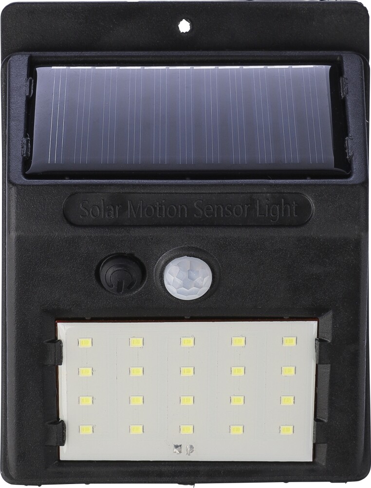 PP solar power light with 20-COB LED. Features a night sensor (CDS) and motion sensor (PIR). Includes an 800 mAh battery capacity, with an charging cable, IP44 rating, and constant or flashing light functions. Individually packaged in a brown cardboard box. Dimensions: 9,6 x 12,5 x 4,8 cm