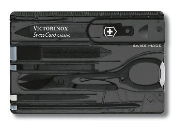 SwissCard Classic obsahuje: 1. nôž na otváranie listov (čepeľ) 2. nožnice 3. nerezový špendlík 4. pilník na nechty so 5. - skrutkovačom 6. pinzeta 7. špáradlo 8. guľôčkové pero 9. pravítko (cm) 10. pravítko (palce)