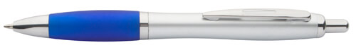 Kugelschreiber aus Kunststoff mit blauschreibender Mine, Metallclip und allischer Oberfläche.