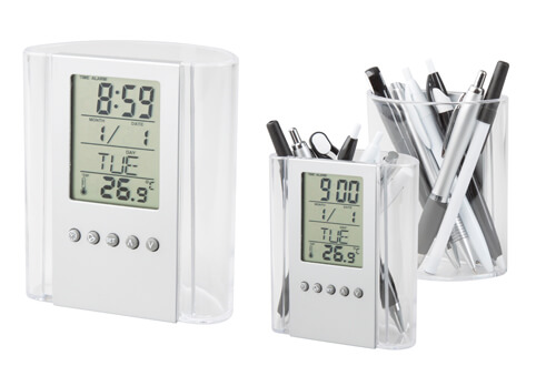 Organizer für Schreibutensilien mit digitalem Display, Uhr, Datum und Thermometer; Lieferung mit Batterie.