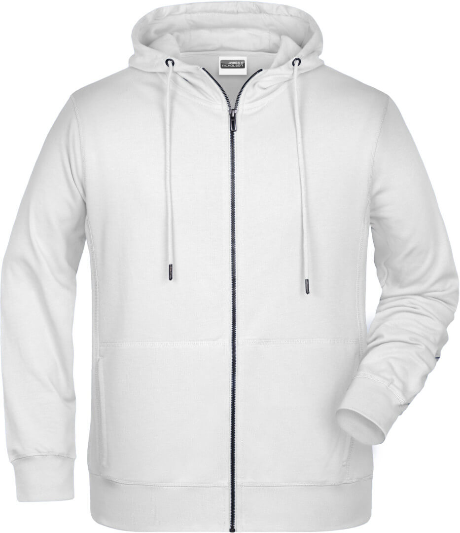 300g/m², 85% gekämmte ringgesponnene Bio-Baumwolle, 15% Polyester, French Terry, Seitliche Teilungsnähte im Vorderteil, doppellagige Kapuze mit Kordelzug, Bündchen mit Elasthan, Kängurutasche, YKK Reißverschluss, Tear off!® - Label