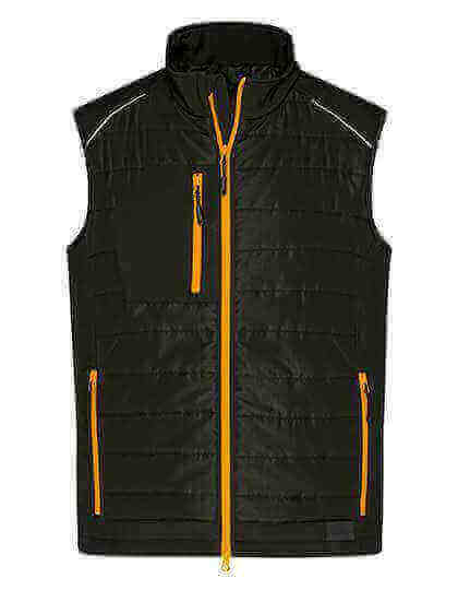 ·340 g/m² ·100% Polyester (gesteppt) ·Graues Innenfutter ·Wasserabweisend ·Elastische, mit Fleece gefütterte Kapuze ·5 cm breite reflektierenden Steifen ·Brust- und Seitentaschen mit Zip ·Große Innentasche ·Reflektierende Paspelierung an Armausschnitten und Bund ·Veredelungszugang innen im Bund.