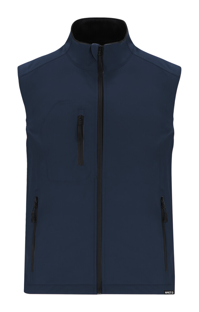 Atmungsaktive, wasser- und winddichte RPET-Softshell-Weste mit Reißverschluss, Brust- und Seitentaschen. Außenseite: 92% Polyester RPET und 8% Elastan. Innenseite: 100% RPET-Polyester-Mikrofleece.