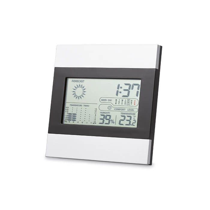 Wetterstation "Shiny Day" : beleuchtete LCD-Anzeige, Aluminiumfront, Alarmfunktion, Datumsanzeige, Thermometer, ausklappbarer Aufsteller auf der Rückseite